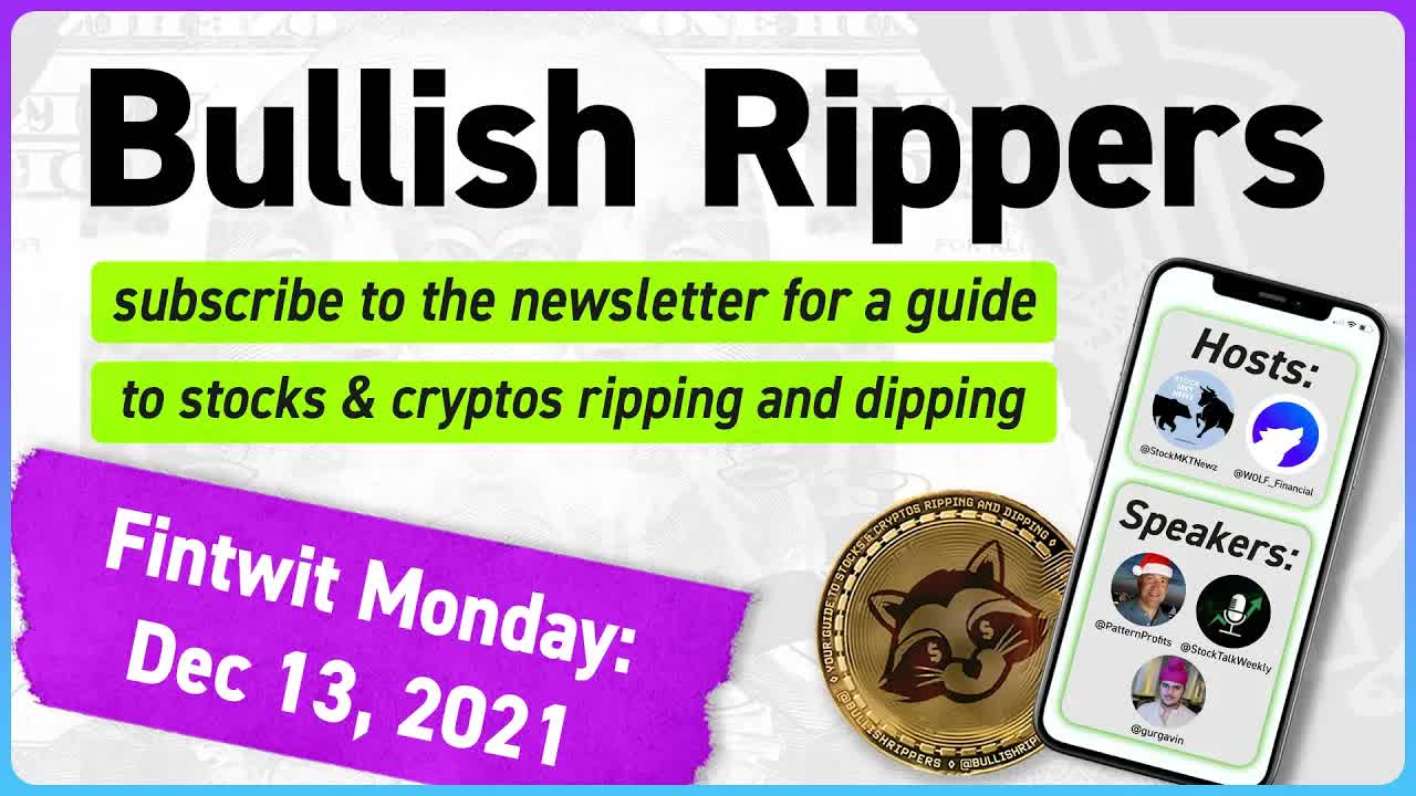 In this recorded Twitter Spaces convo we get ready for week ahead in the market. Listen to set yourself up well for the week. Air Date: December 13, 2021 Hosts @StockMKTNewz: twitter.com/StockMKTNewz @WOLF_Financial: twitter.com/WOLF_Financial Speakers: @StockTalkWeekly @PatternProfits and @Gurgavin Subscribe to our newsletter to follow the stocks and cryptos that are ripping and dipping https://bullishrippers.beehiiv.com/subscribe Bullish is a conversation about money for the curious. Earn more, spend smarter and grow your money in a way that's right for you. Follow us https://bullishstudio.com https://twitter.com/BullishStudios https://www.instagram.com/bullishstudios/